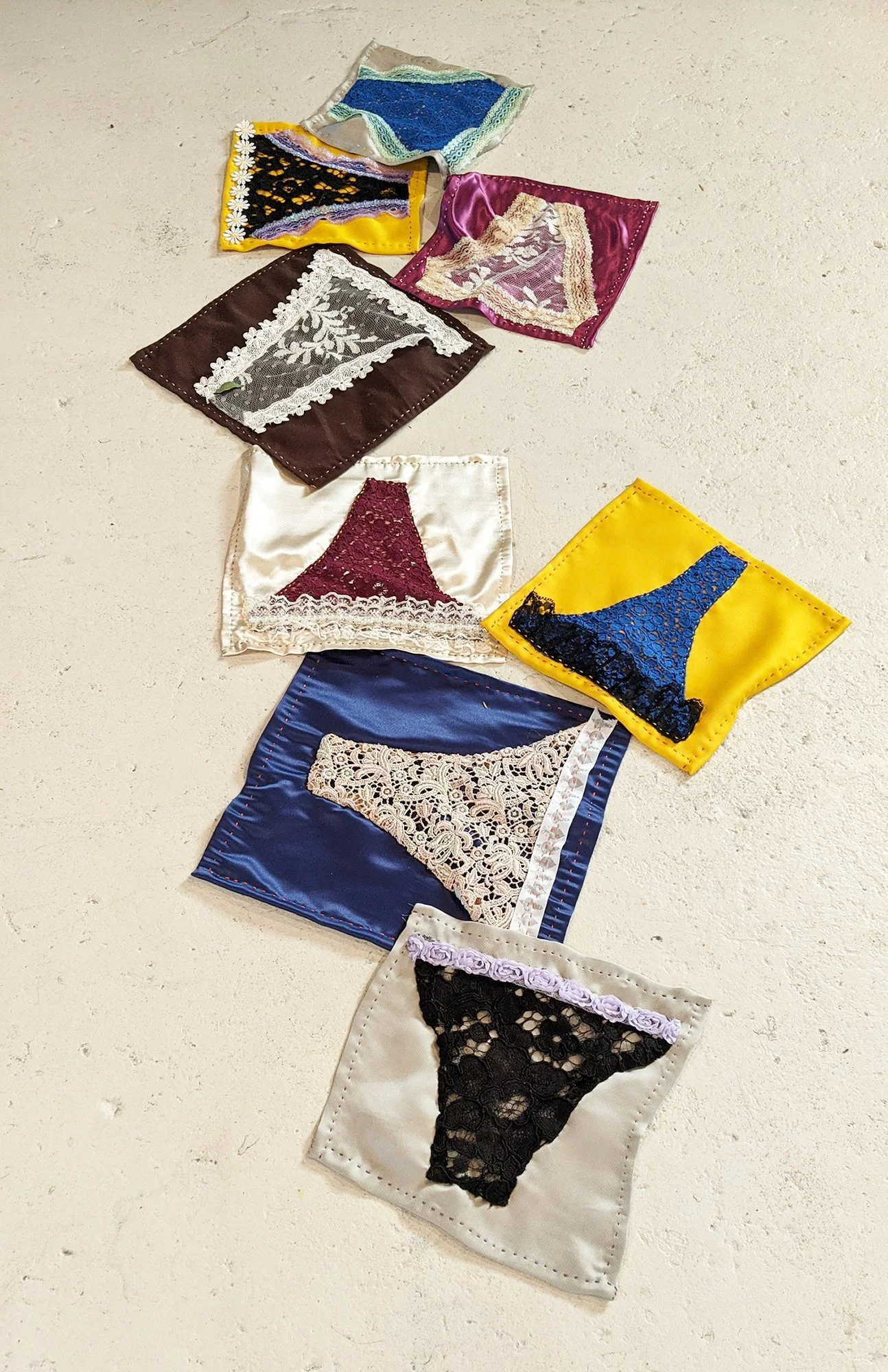 “Not Consent” protests victim blaming in sexual assault cases, being conceived upon hearing a defendant was found not guilty of rape due to the victim wearing lace undies which was considered to be signalling consent. I protest this “signalling consent” attitude by using semaphore, an analogue signalling system whereby hand-held flags are positioned to signal alphabet letters. In this work fabric squares contain a female symbol holding flags onto which lace undies are stitched, with each square signalling a semaphore alphabet letter. Squares are sewn together forming banners. One side of a large double-sided banner spells “Not Consent”, the other “No Means No”. Two single-sided banners spell “No Shame” and “Not A Slut”.