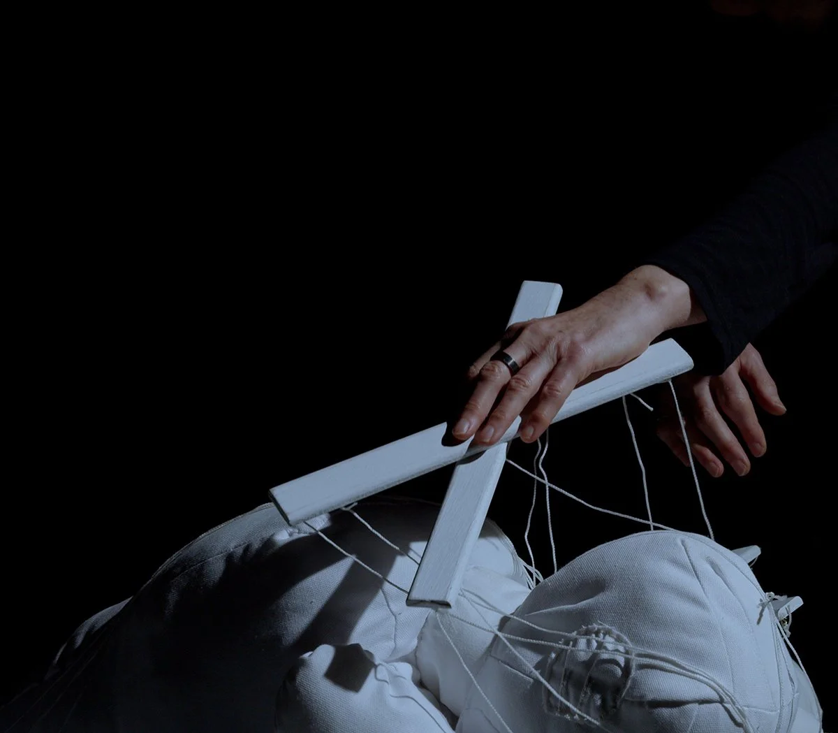 Sculptural puppets perform with their puppeteer in Beautiful Vulnerability (2025), 11 minutes